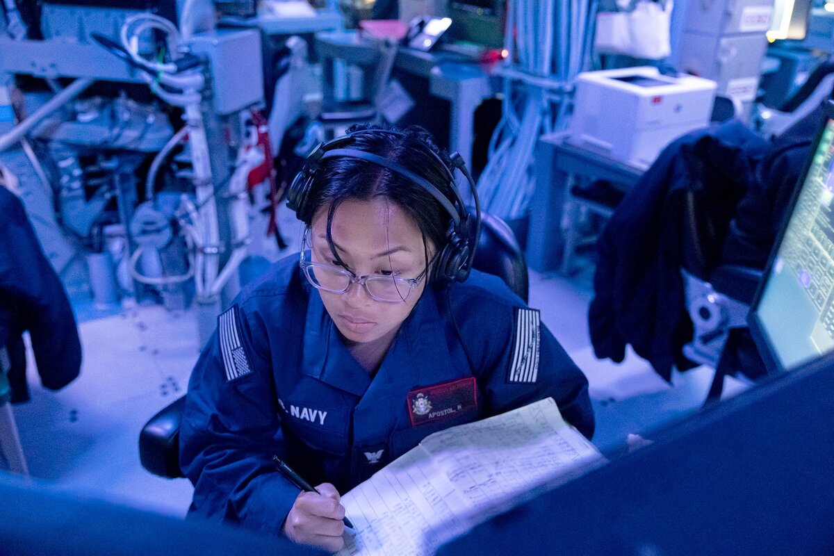 PHILIPPINE SEA (March 1, 2024) Cryptologic Technician (Technical) 3rd Class Hannah Apostol, from Waipahu, Hawaii, stands watch in the combat information center aboard the Arleigh Burke-class guided-missile destroyer USS Rafael Peralta (DDG 115) as it sails in the vicinity of the Luzon Strait while conducting routine underway operations.