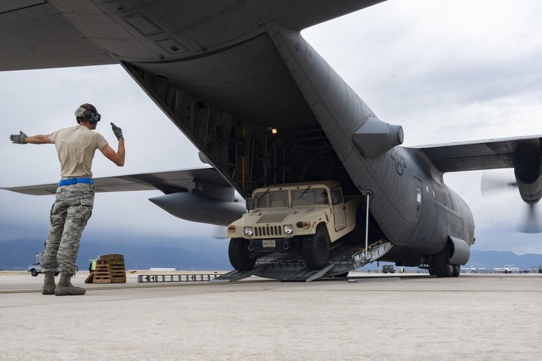 Tech. Sgt. Russell Hudson, 39th Aerial Port Squadron air transportation technician, directs a vehicle as it is backed into a C-130 Hercules aircraft during an engine-running onload at Peterson Air Force Base, Colo., April 17, 2019. Hudson is one of six team members representing the 39th APS at the Air Force Reserve Command’s biannual Port Dawg Challenge at Dobbins Air Reserve Base, Ga., April 22-26 (U.S. Air Force photo by Tech. Sgt. Frank Casciotta)