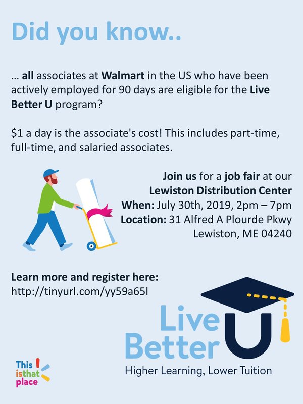 Do you know about the Walmart Live Better U program? At Walmart, we help our customers live better and our associates too! Visit us at our job fair in Lewiston, Maine on July 30th to learn more and join our team. To register, click the following link: http://tinyurl.com/yy59a65l