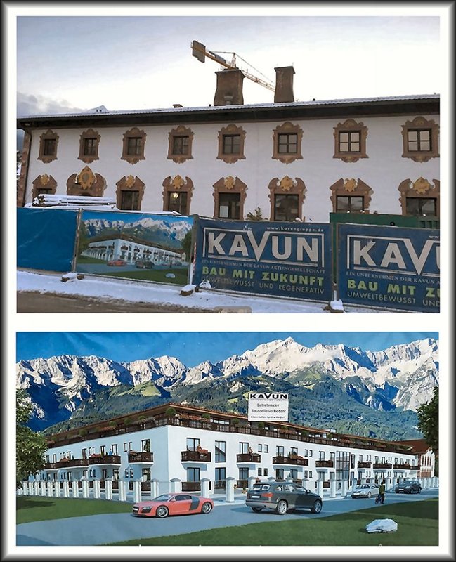 Photo and drawing of the old General Patton Hotel in Garmisch-Partenkirchen, Germany.