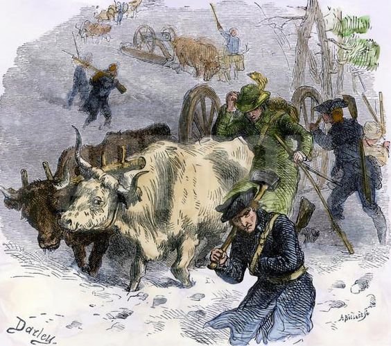 3. Ethan Allen, Benedict Arnold and the 'Green Mountain Boys' taking the captured British guns from Fort Ticonderoga to Boston in 1775