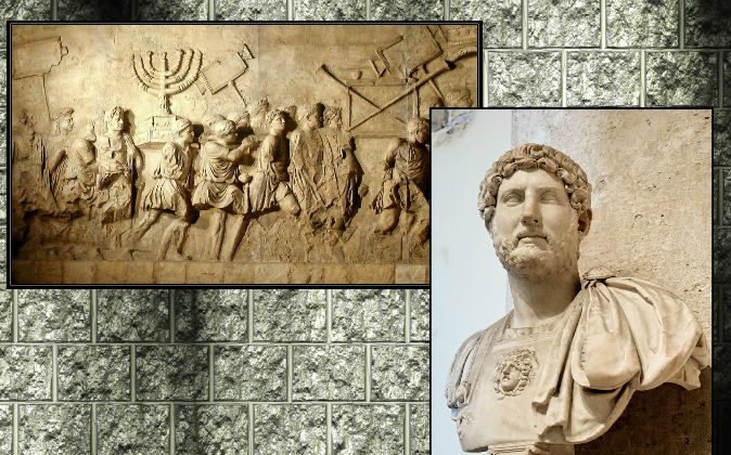 4. Left_Roman Triumphal arc showing Roman soldiers plundering Jewish treasures. Right:_A marble bust of the Emperor Hadrian.