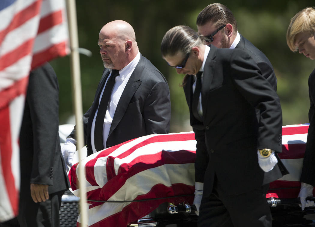 Rick Harrison, left, serves as a pallbearer the funeral service of his father, 'Pawn Stars' patriarch, Richard Benjamin Harrison, known as 'The Old Man,' at Palm Northwest Mortuary in Las Vegas on Sunday, July 1, 2018.