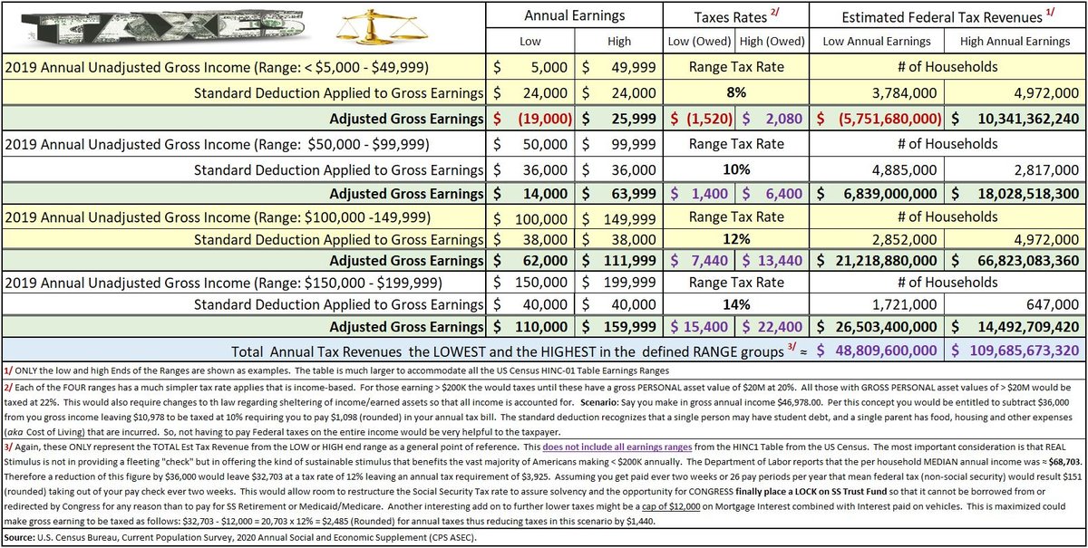 Would it not be simpler to simply increase the standard deduction for single or joint income households to $36,000 (graduated) who make < $ 175,000 in unadjusted gross income for the next 36 months and increase the tax rate by 2% on all earners? Here is a table that summarizes the idea.
