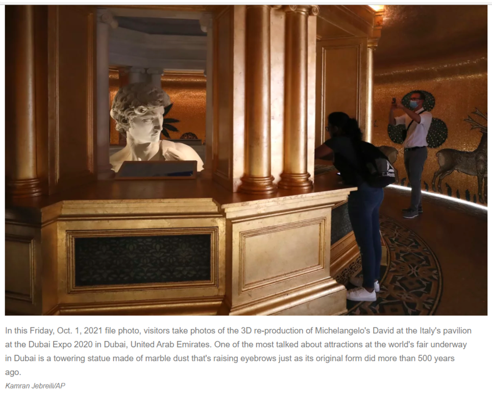 At Italy's pavilion, a 3D replica of Michelangelo's David stands tall, his gaze intense and defiant. For most visitors, though, David's head is all they will see as they tour the pavilion. Only VIPs with special access will be able to catch a view of the statue from head to toe while it's on display for the next six months at Dubai's Expo 2020.