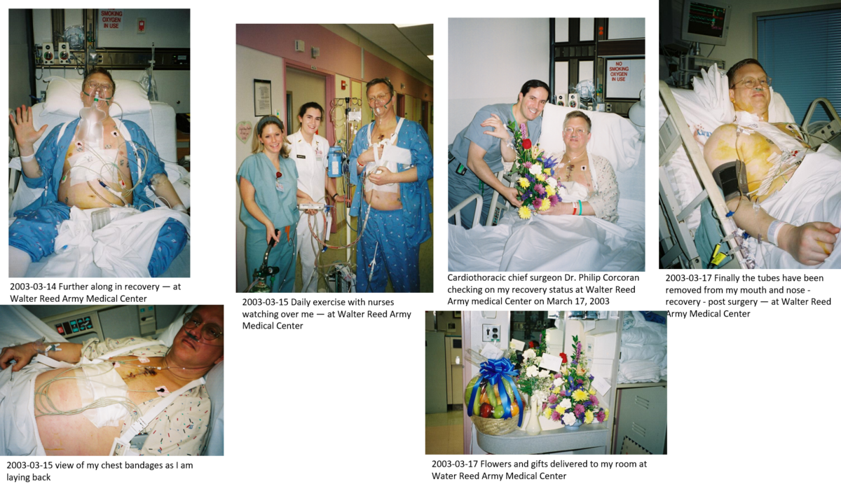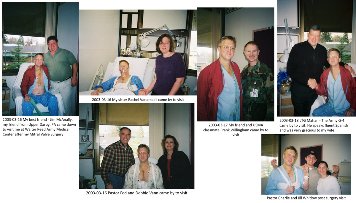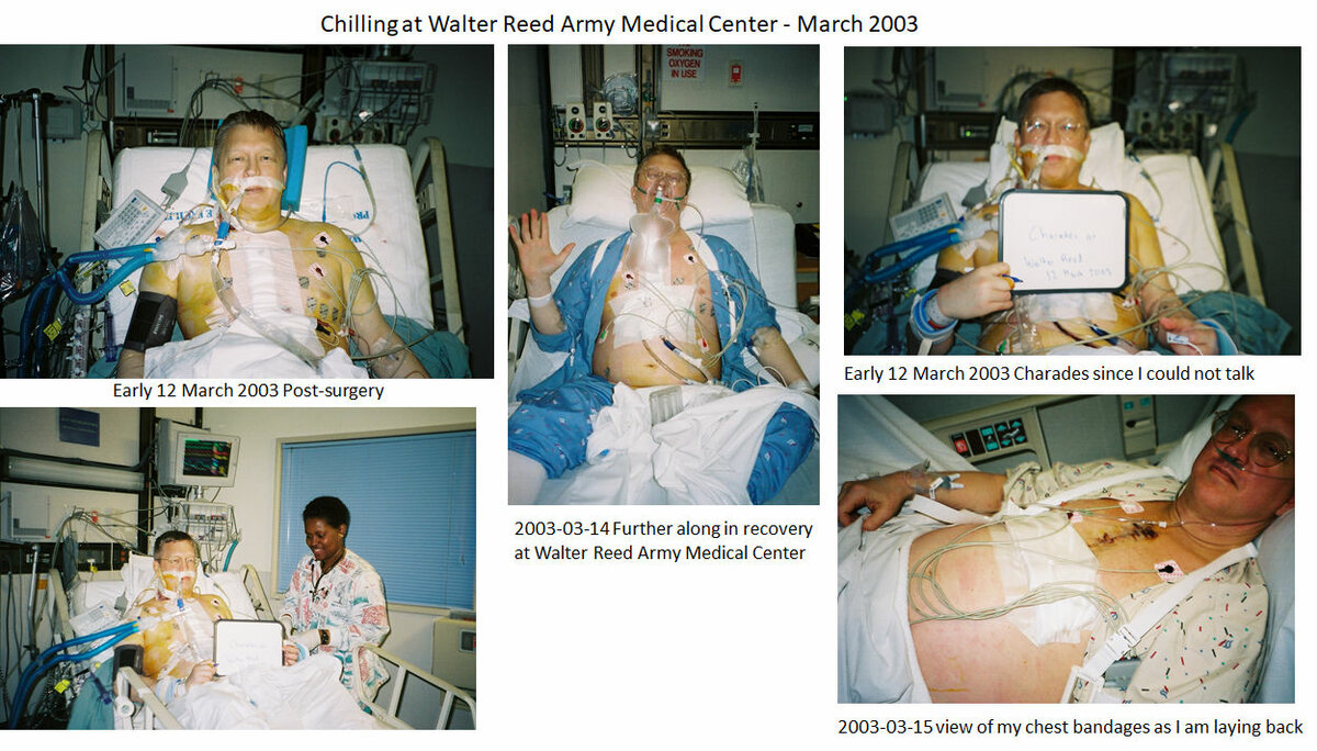 On March 11, 2003 I drove my darling wife to Walter Reed Army Medical Center and arrived before the 0600 appointment for cardiothoracic surgery to replace or repair my mitral valve which was leaking severely at that point.