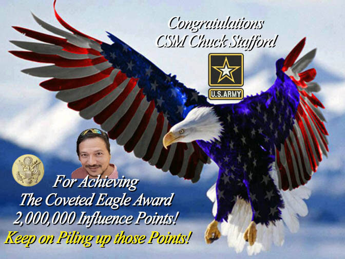 Good Sunday afternoon, my Brothers and Sisters in arms!!! I am very honored, proud, and excited to “SHOUT OUT TO EVERYONE” that our good friend, CSM Chuck Stafford (Command Sergeant Major - 741st MI, 704th MI BDE, INSCOM | Fort Meade, MD), has reached and exceeded His 2,000,000 Point threshold and is beginning to soar from the WFL and VFV Eagle’s Nest!!! Chuck has been steadily moving up the Eagle's Nest and I, for one, look forward to his humorous and serious postings!!! Chuck has now attained 2,010,129 Influence Points as I write this tribute!