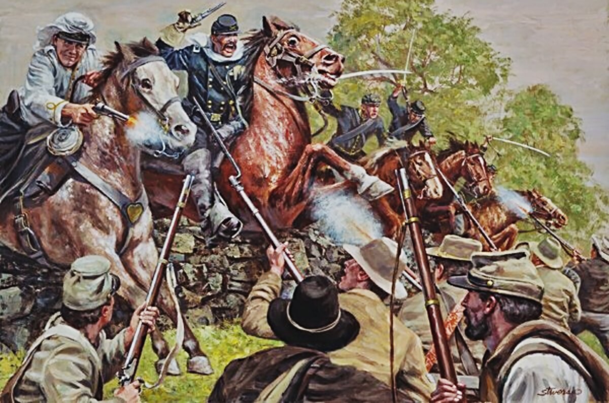 In case of Pickett’s success, Gen. Jeb Stuart was to ride around the Federal right flank and endanger their retreat route. But a few miles east of the Cemetery Hill, Stuart meets Gen. David Gregg’s Union cavalry, and there is inconclusive fighting, mostly mounted, between the mounted arms of both armies. Finally, a reckless saber charge by newly-promoted Brig. Gen. George A. Custer and his brigade of Michiganders blunts Stuart’s advance, and decides the contest in the Yankee’s favor: one more cavalry defeat for Stuart in a long list of them on this campaign.