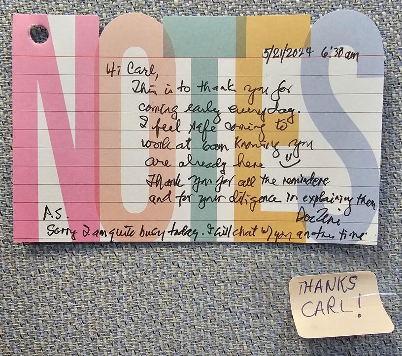 One day I found a kind note from a doctorate, who appreciates coming in early in dark hours, due to she knows I'm at location.