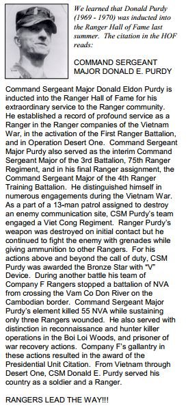 First I want add that CSM Purdy is one of my Heros. I have great respect for him and people of his caliber. This is how he felt about the Army. It was true back when he was in and will always be a battle that we will be facing. Soldiers like him are rare as they will tell you what you need to hear and not what you want to hear. The photo is of his citation in the Ranger Hall of Fame. He was also a member of SFOD-D back in the day.