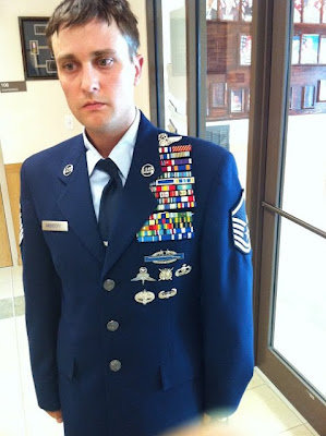 SSG Michael Hartsfield This one is my favorite. It is like he saw one too many movies on the sci fi channel (which put Navy SWO as a collar device in one of their bad movies), and built his uniform from there.