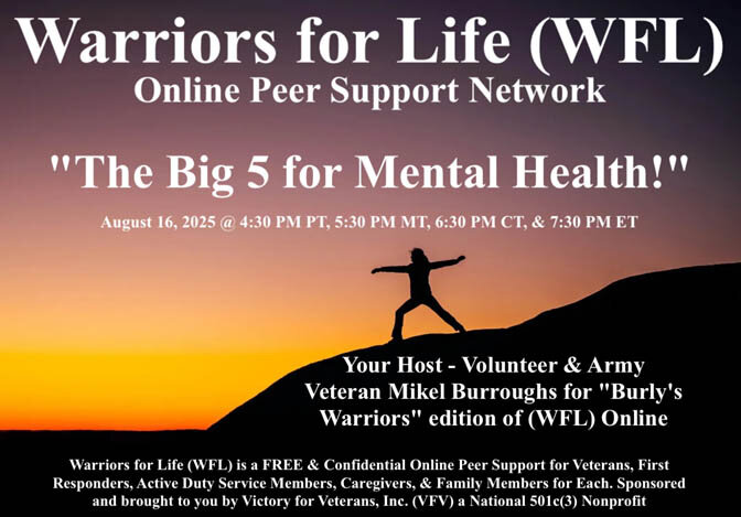 Warriors for Life (WFL) Peer Support Network Online "Burly's Warriors" edition, presented by Victory for Veterans, Inc. (VFV) — (TONIGHT), August 16, 2025 @ 4:30 PM PT, 5:30 PM MT, 6:30 PM CT, & 7:30 PM ET