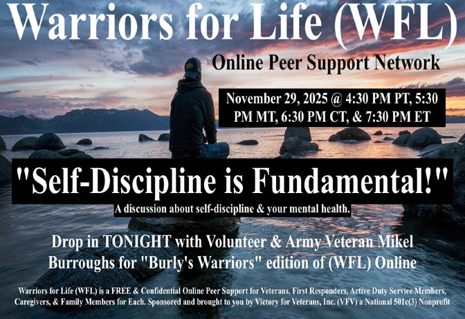 Warriors for Life (WFL) Peer Support Network Online "Burly's Warriors" edition, presented by Victory for Veterans, Inc. (VFV) — (TONIGHT), November 29, 2025 @ 4:30 PM PT, 5:30 PM MT, 6:30 PM CT, & 7:30 PM ET