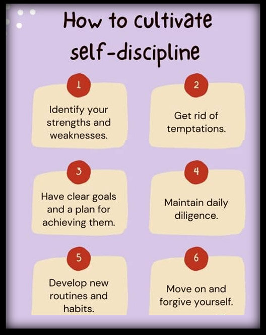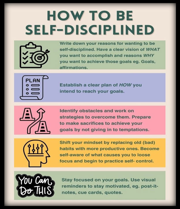 Start with self-care: Discipline is a form of self-care. Focusing on small, consistent acts of self-care, like sticking to a plan or exercising regularly, builds discipline over time.