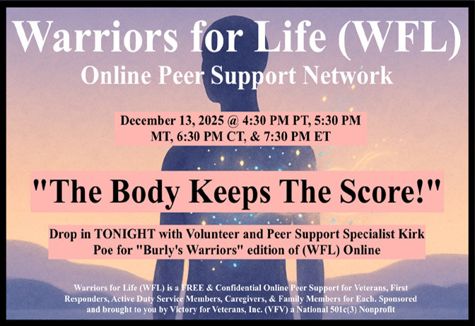 Warriors for Life (WFL) Online "Burly's Warriors" edition, presented by Victory for Veterans, Inc. (VFV) — (TONIGHT), December 13, 2025 @ 4:30 PM PT, 5:30 PM MT, 6:30 PM CT, & 7:30 PM ET