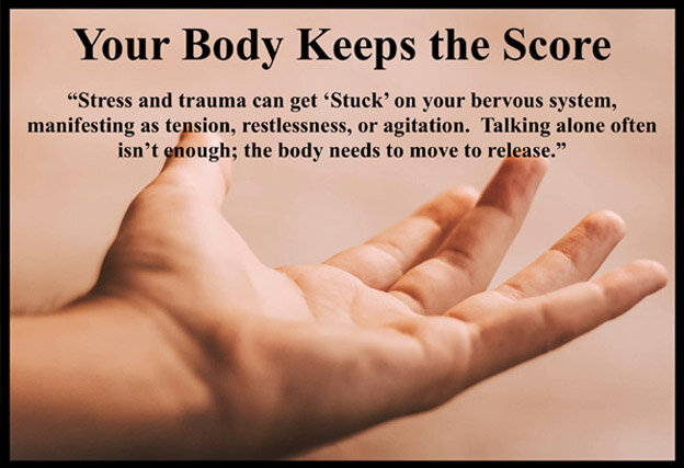 Trauma gets "stuck" in the body, causing physical symptoms (tension, anxiety, pain); healing requires addressing these somatic memories.