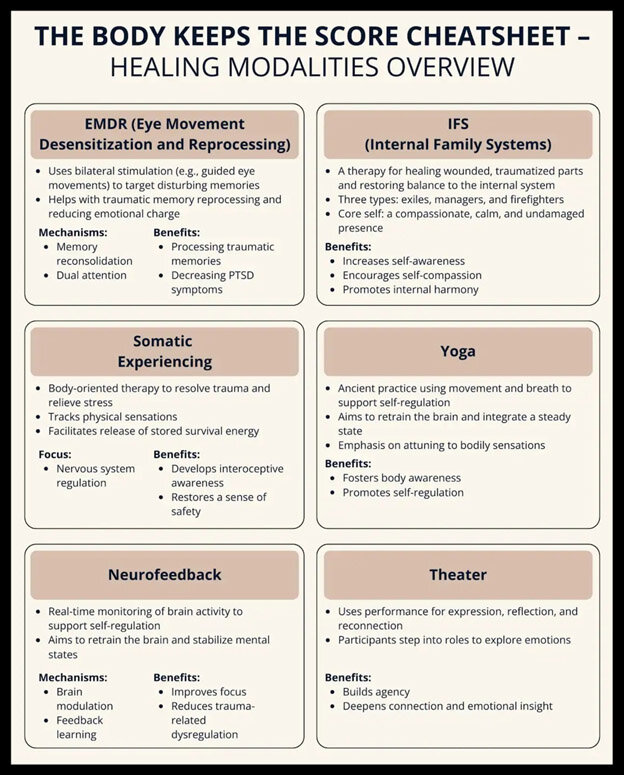 The Body Keeps the Score promotes a holistic healing approach for trauma, emphasizing that healing requires engaging the body, not just the mind, through "bottom-up" methods like yoga, EMDR, neurofeedback, and expressive arts (dance, theater) alongside traditional "top-down" talk therapy, helping individuals safely process physical sensations, reconnect with their present selves, and rewire trauma's impact on the brain and nervous system.
