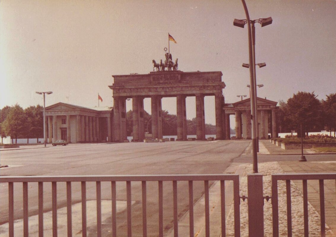 And the last picture is of Brandenburg Gate in the early seventies. And it was not restored at all. Just draped with big Hammer and Sickle flags. East Germany was dull and gray looking. And that was before the massive Soviet Union Apartment Blocks were built.