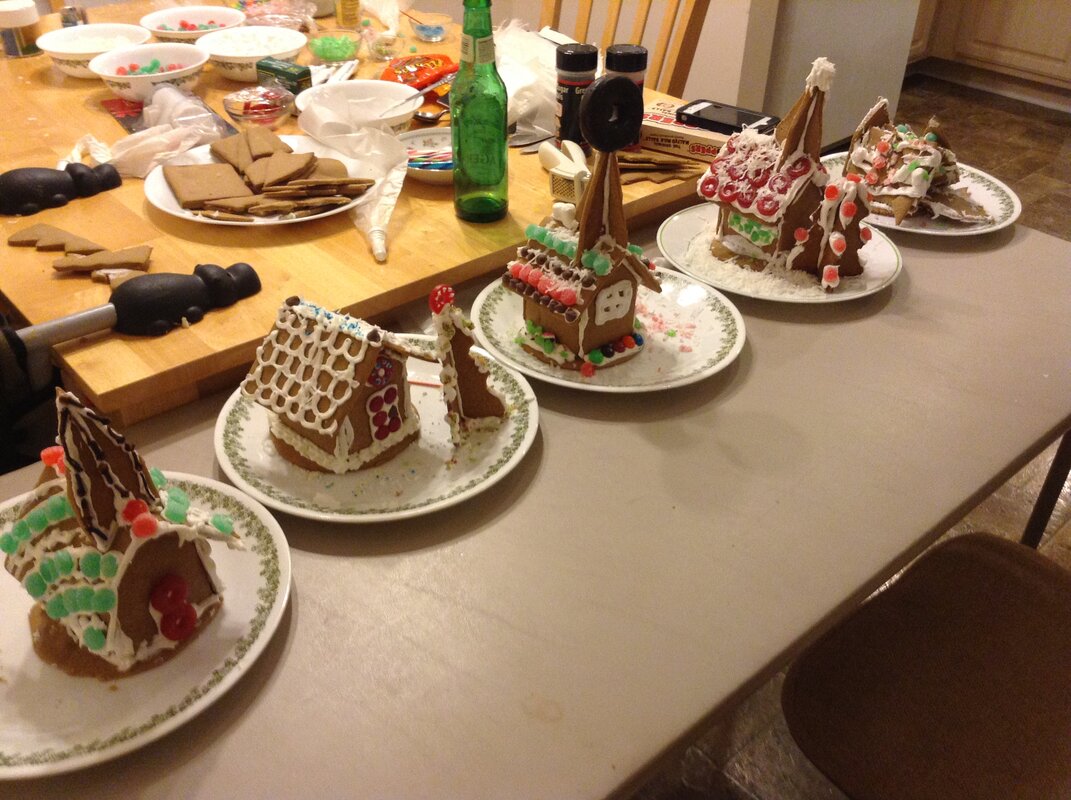 I have been looking through last year's Christmas photos...and came across the Ginger Bread House making we did. My Kathy and my Daughter's made the very pretty ones. The one on the far right? The gingerbread mess, that looked like a hurricane hit it. Yes, that one is mine. And it was my best effort too.