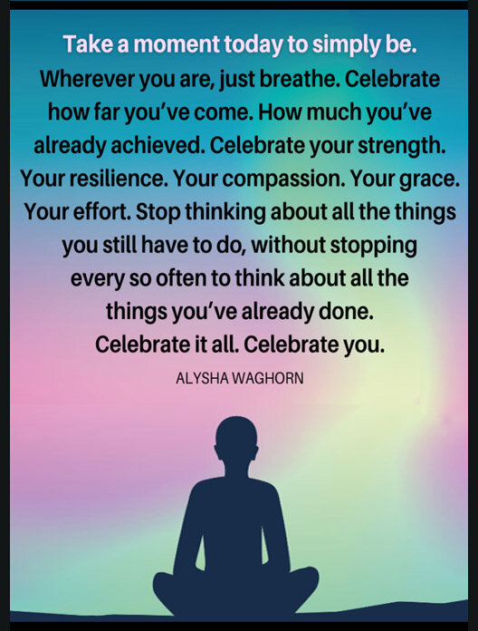 “Take a moment today to simply be. Wherever you are, just breathe. Celebrate how far you’ve come. How much you’ve already achieved. Celebrate your strength. Your resilience. Your compassion. Your grace. Your effort. Stop thinking about all the things you still have to do, without stopping every so often to think about all the things you’ve already done. Celebrate it all . Celebrate you.” — Alysha Waghorn