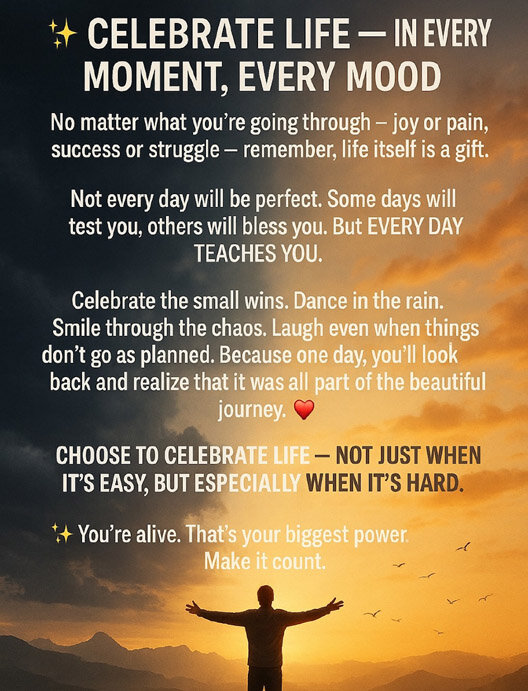 “Celebrate life — in every moment, every mood no matter what you’re going through —joy or pain, success or struggle — remember, life itself is a gift. Not every day will be perfect. Some days will test you, others will bless you. But every day teaches you. Celebrate the small wins. Dance in the rain. Smile through the chaos. Laugh even when things don’t go as planned. Because one day, you’ll look back and realize that it was all part of the beautiful journey. Choose to celebrate life – not just when it’s easy, but especially when it’s hard. You’re alive. That’s your biggest power. Make it count!” — Unknown Author
