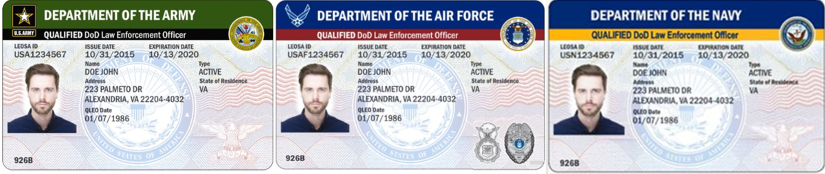 DoD has made it easier for individuals that meet the criteria of LEOSA to obtain credentials by standardizing the card (the only difference is the military department name on the card) and having one entity process them for all active or separated military (Defense Consulting Services, LLC). For example, active service members or veterans from the Army apply through the 'LEOSA - Army' website*; Navy individuals apply through the 'LEOSA - Navy' website*; etc.