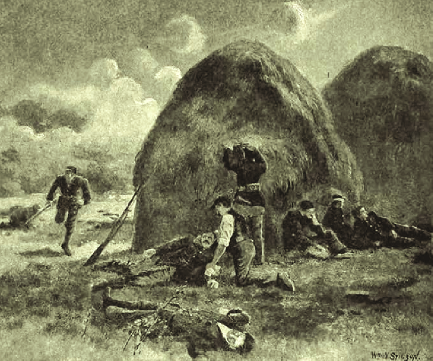 As the day dragged on Assistant Surgeon Curran looked around to see if there were any suitable locations to gather the wounded men in a temporary field hospital. He finally found what he was looking for: ‘Close to the lines, and a little to the right, were a number of straw stacks. (2nd Picture) I visited the place and found that many of the disabled had availed themselves of this protection. Without delay I had the wounded led or carried to the place, and here, with such assistance as I could organize, although exposed to the overhead firing of shot and shell, I worked with all the zeal and strength I could muster, caring for the wounded and dying until far into the night.’ Curran remained worried that the straw stacks offering frail protection the men would catch light, as they were still being subjected to heavy fire. While the Clareman was treating the leg of one wounded soldier he briefly turned away to get a dressing for the injury. Turning back, Curran was horrified to see that the unfortunate man’s leg had in the meantime been carried off by a cannonball.