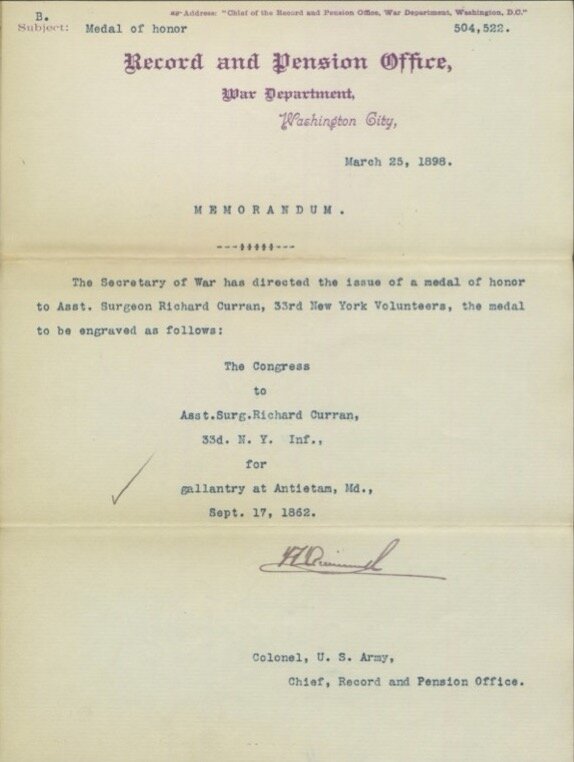 Excellent MOH History of and for Assistant Surgeon (Highest Rank: Surgeon) Richard J. Curran, US Army, 33rd New York Infantry, Date of Action: 1862, Home Town: Ennis, Location of Action: The Battle of Antietam, Maryland.