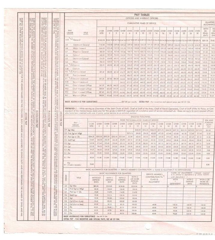 I made $110 a month. A year later that bumped up to $125. And when I got to PFC...I darn near hit $150! I was rolling in dough! Like most of the guys I was with in the Infantry...we sent Mom most of our money. In my case, I kept $25 and sent the rest to her. And I got paid in Cash, once a month.