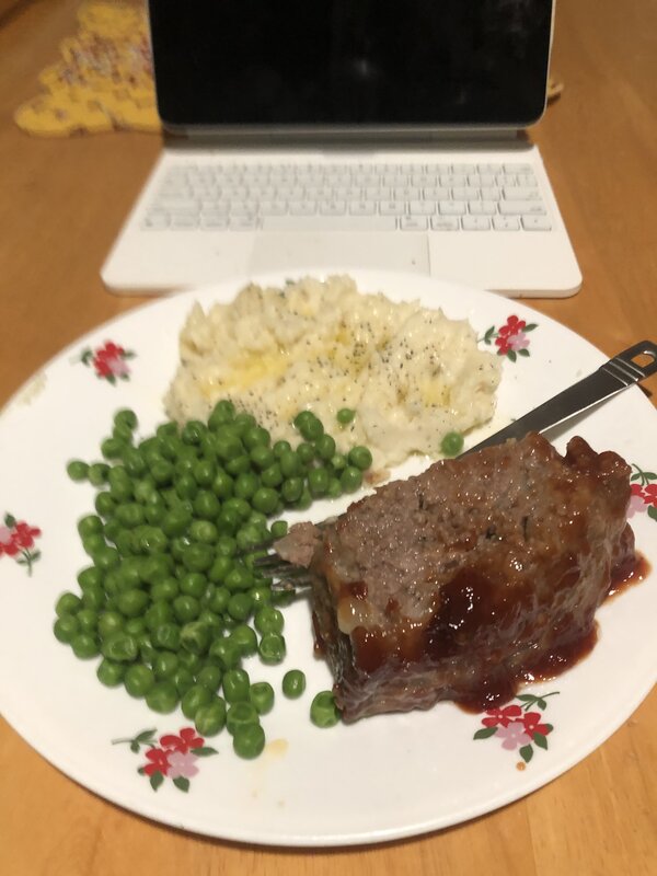 Now I am upset. Can't get the timing down right. So I have to feed her something to curb her appetite until the meatloaf is ready...so it is Ala carte with potatoes and peas. Sigh. Not a nice presentation on a warm platter.