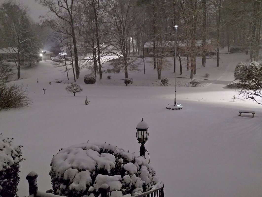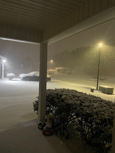 It is midnight. I took these two pictures...on facing North, one facing South. Snow is falling pretty steady now. So by morning, we will be in full Snowmageddon. I am happy that the kids will get to build their forts, play on the ice hockey pond, and sled in their canoe.