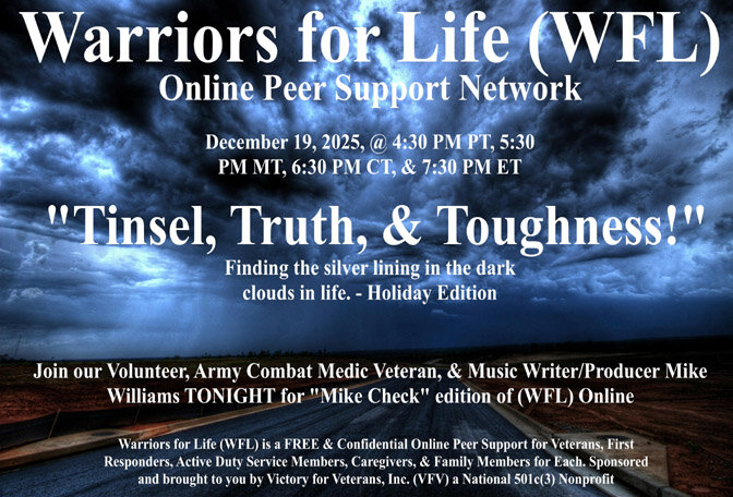 Warriors for Life (WFL) Online "Mike Check" edition presented by Victory for Veterans, Inc. (VFV) — Friday (TONIGHT), December 19, 2025, @ 4:30 PM PT, 5:30 PM MT, 6:30 PM CT, & 7:30 PM ET